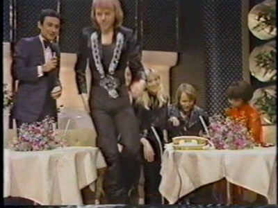 They also used the same 4-colour ABBA logo in the background as used in Eagle in the ABBA Special (blue, green, yellow, red). However for this performance of Dancing Queen (blue, yellow, green, red) they got the two B's in the wrong order so the logo does not quite look correct.